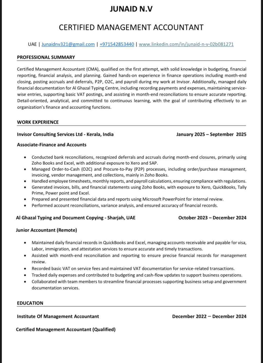 محاسب اداري معتمد (CMA) يتمتع بخبرة سنتين في مجال المالية والمحاسبة، تشمل أقفال نهاية الشهر، تسويات البنوك، الاستحقاقات والمصروفات المقدمة، عمليات O2C وP2P، الحسابات الدائنة والمدينة، الرواتب، وتسجيلات ضريبة القيمة المضافة. يجيد استخدام MS Excel (VLOOKUP وPivot Tables) وبرامج المحاسبة مثل Zoho Books وQuickbooks وXero وTally Prime وSAP. متاح للانضمام فورا داخل دولة الامارات