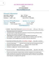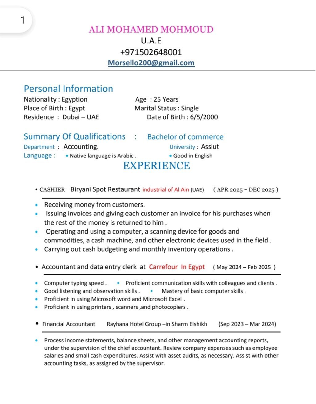 خريج كلية تجارة قسم محاسبة مالي لدي خبرة سنتين داخل مصر وسنة في الامارات في مجال المحاسبة وعلي دراية تامة بمعظم الاجراءات المالية واعداد التقارير المحاسبية والمعاملات البنكية والمعاملات لدي الموردين والعملاء وخبرة في البرامج المحاسبية والكاشير والأوفيس والتحدث باللغة الانجليزية لدي اقامة قابلة للاعارة