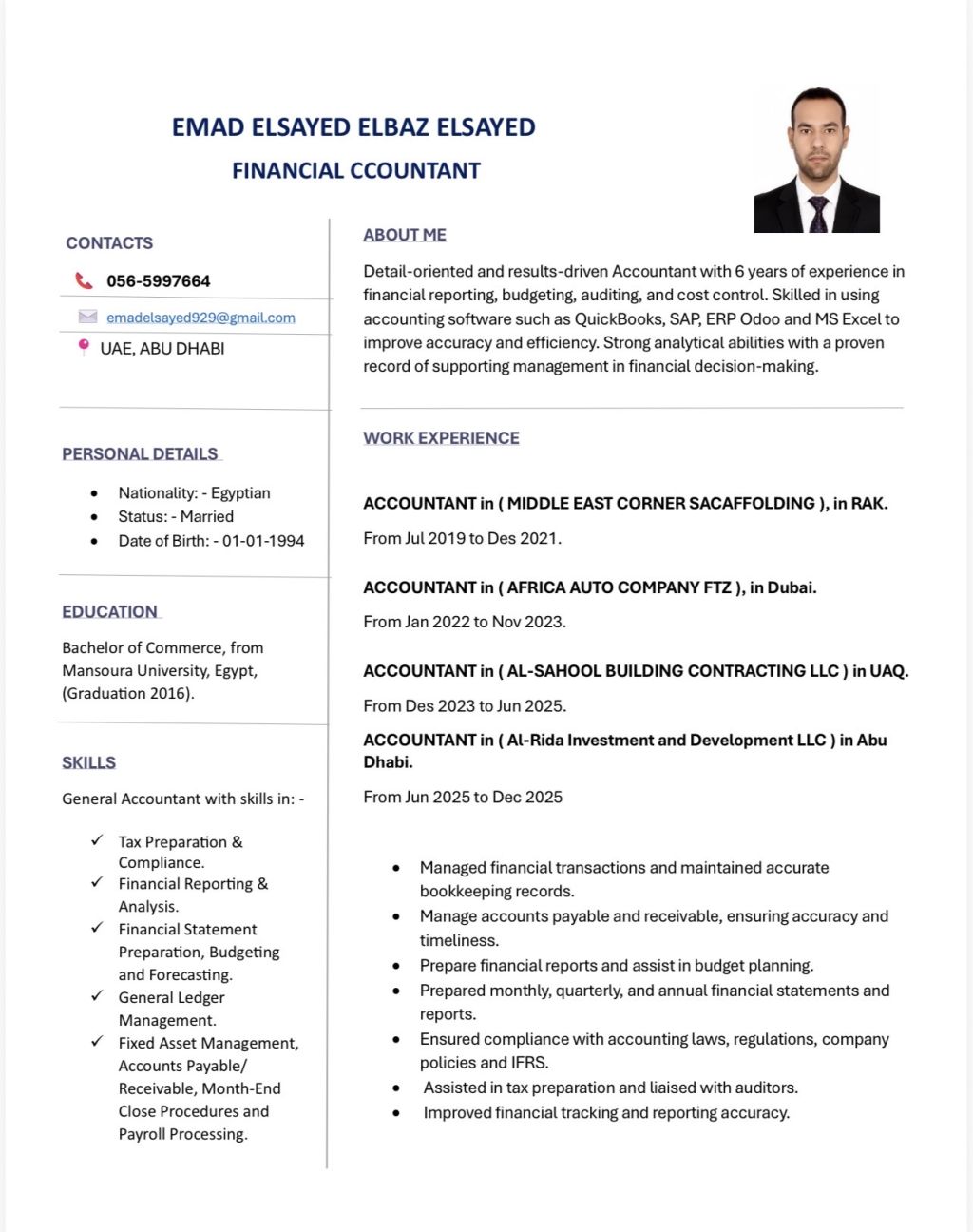 أنا محاسب مالي خبرة 6 سنوات داخل الدولة، خبرة في مجال المحاسبه، خبرة في اعداد التقارير والقوائم الماليه، اعداد الضرائب والتسجيل والاسترداد الضريبي، اعداد نظام محاسبي كامل والمتابعة والتدقيق علي الفواتير وكشوف الحسابات من الموردين ومتابعه حسابات العملاء خبرة في البرامج المحاسبية ERP والأكسيل والبوربوينت