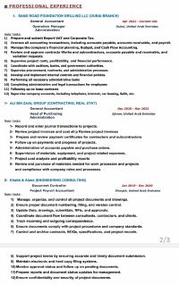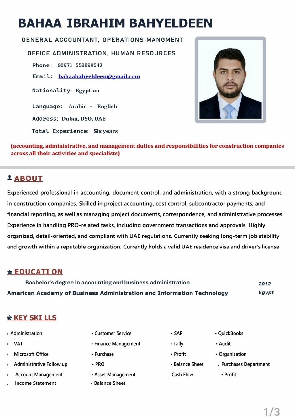 محاسب واداري ذو خبرة تزيد عن 6 سنوات في قطاع البناء. ماهر في جميع جوانب الإدارة، بما في ذلك مراقبة التكاليف، دفع مستحقات المقاولين الفرعيين، فوترة العملاء، التقارير المالية، وتنظيم الايرادات والمصروفات. ملم بجميع أنواع المعاملات الحكومية، بما في ذلك خدمات PRO وتجديدات متعددة. متاح للبدء فورا. لدي اقامة ورخصة قيادة اماراتية سارية المفعول. على استعداد للخضوع لتقييمات أو فترات تجريبية لاثبات القدرات