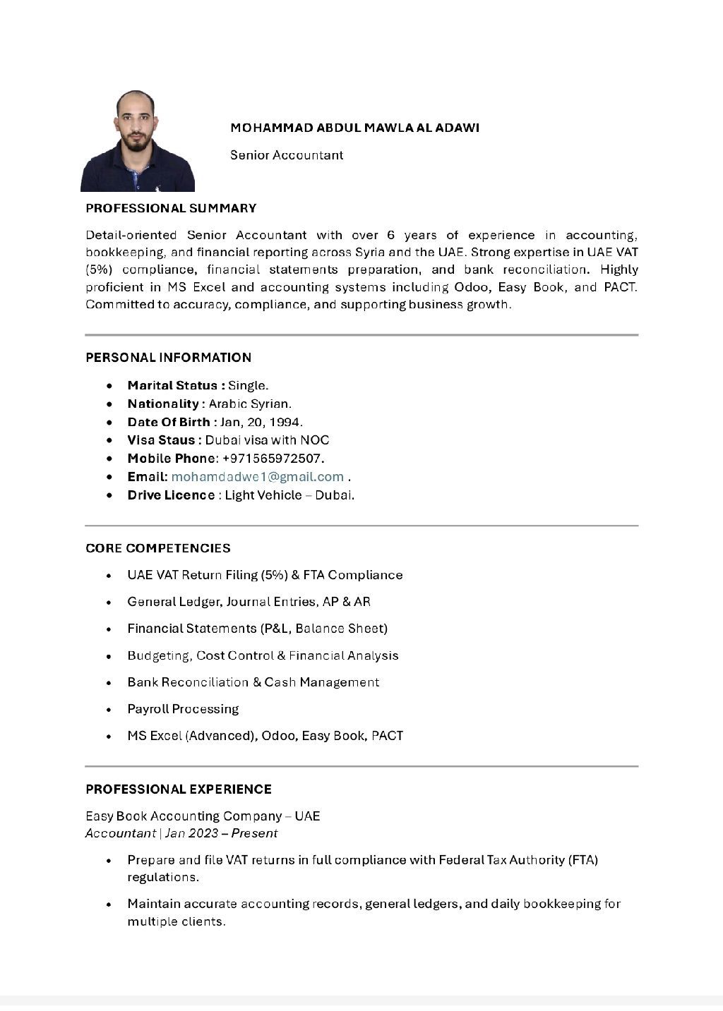 محاسب لديه خبرة في جميع الامور المالية والمحاسبية تشمل المتابعة والتدقيق المالي وبالاضافة لخبرة ممتازة في الضريبة يبحث عن عمل بدوام جزئي لديه سيارة وليسن وجاهز للعمل فورا يرجى التواصل ع الرقم