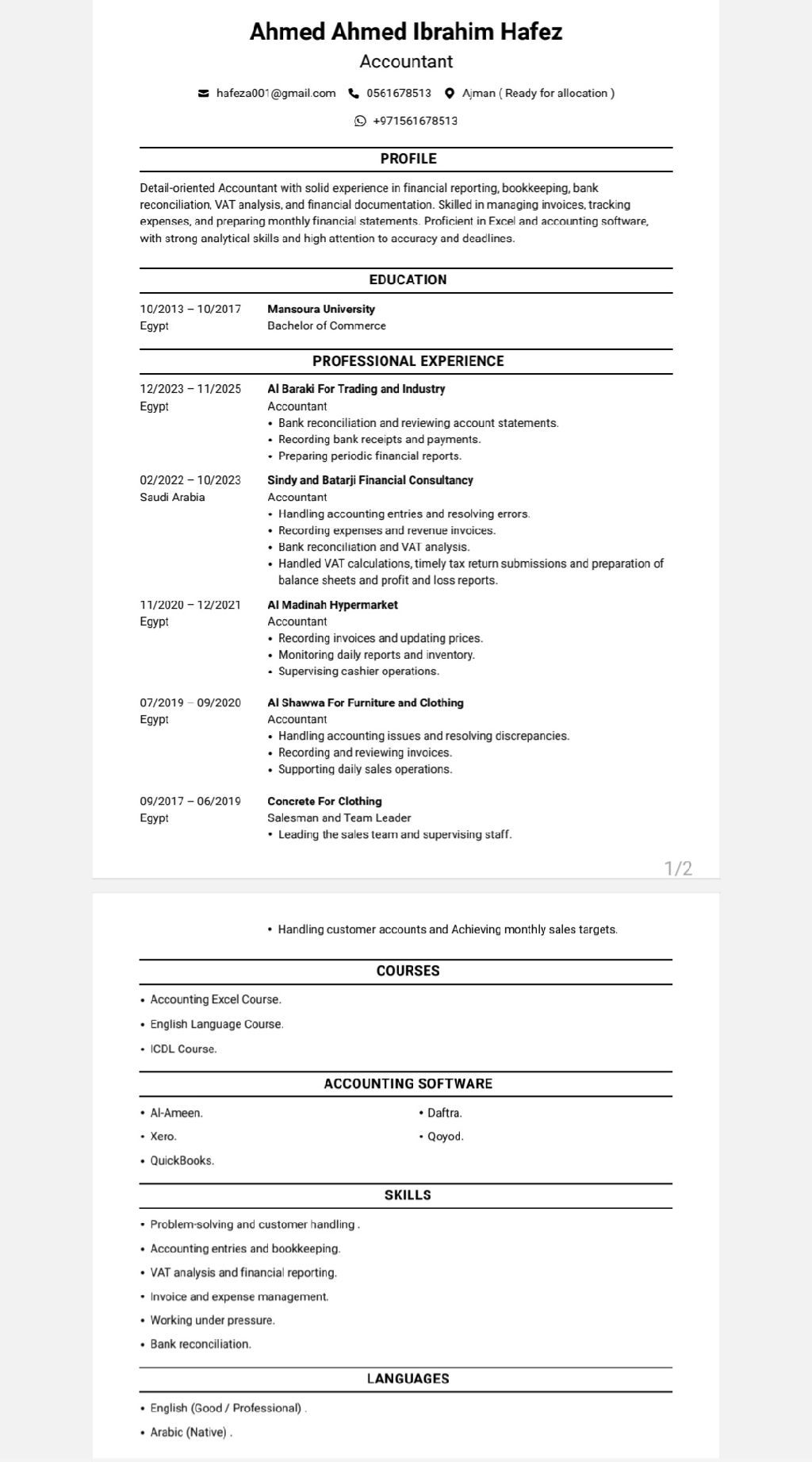 محاسب خبرة أكثر من 5 سنوات، أجيد العمل على Excel والقيود اليومية واعداد التقارير المالية، سبق لي العمل في متابعة الايرادات والمصروفات والعملاء والموردين، ملتزم ودقيق في العمل، جاهز للعمل بدوام كامل أو جزئي. وخبرة في برنامج الأمين & Quickbooks & Xero دفترة. وأملك إقامة سارية لمدة عامين وقابلة للنقل