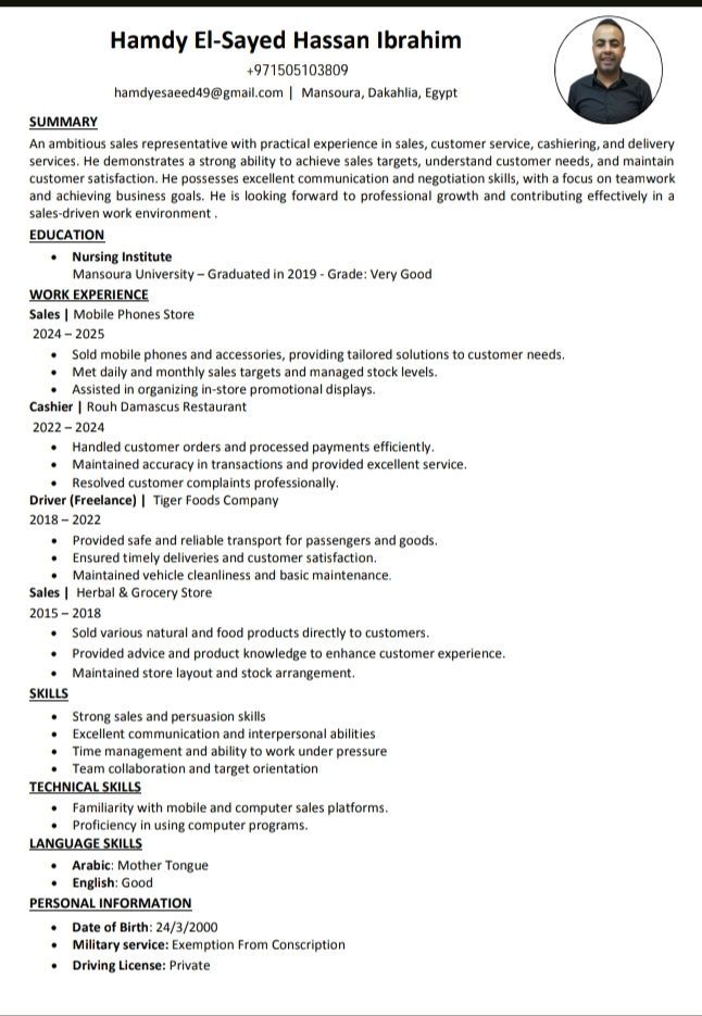 أنا اسمي حمدي السيد 26 سنة متواجد في الامارات في أماراه رأس الخيمة أم القيويون طلب ايجاد شغل اشتغلت في مصر سائق برخصة خاصه واشتغلت سائق دليفري وكاشير ومندوب مبيعات في شركة تايجر وسيلز في محل أكسسوارات محمول وسيلز في محل سموكنج