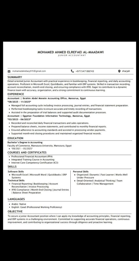 محاسب مصري خبرة أكثر من 8 سنوات داخل دولة الامارات علي دراية جيده بجميع المعاملات المحاسبية وبرامج المحاسبه والضرايب ولدي رخصة قيادة