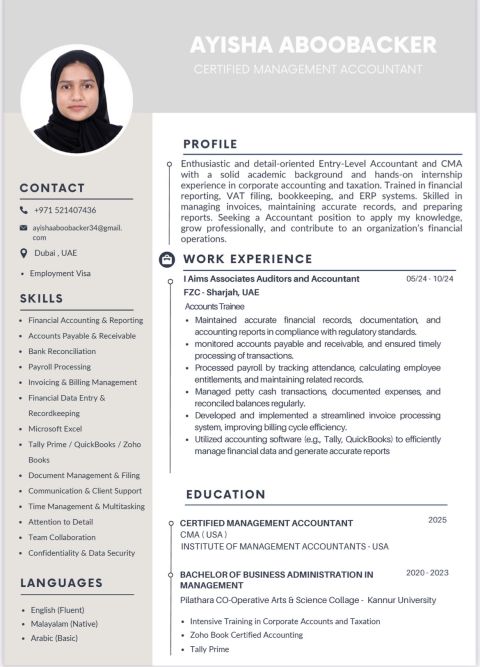 Certified Management Accountant (CMA) with 2 years of experience in finance and accounting, including month - end closing, bank reconciliation, accruals and deferrals, O2C, P2P, AP/ AR, payroll, and VAT postings. Proficient in MS Excel (VLOOKUP, Pivot Tables) and accounting software like Zoho Books, Quickbooks, Xero, Tally Prime, and SAP. Available for immediate joining in the UAE