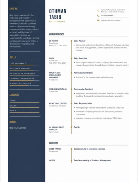 عجمان - الامارات جاهز للعمل فورا خبرة في المبيعات، الريتيل، الكاشير، والكول سنتر عملت مع ZARA - LC Waikiki - Marjane - Call Center المهارات خدمة العملاء - تحقيق التارجت - الكاشير وإدارة المخزون - ترتيب وعرض المنتجات اللغات عربي - انجليزي - فرنسي