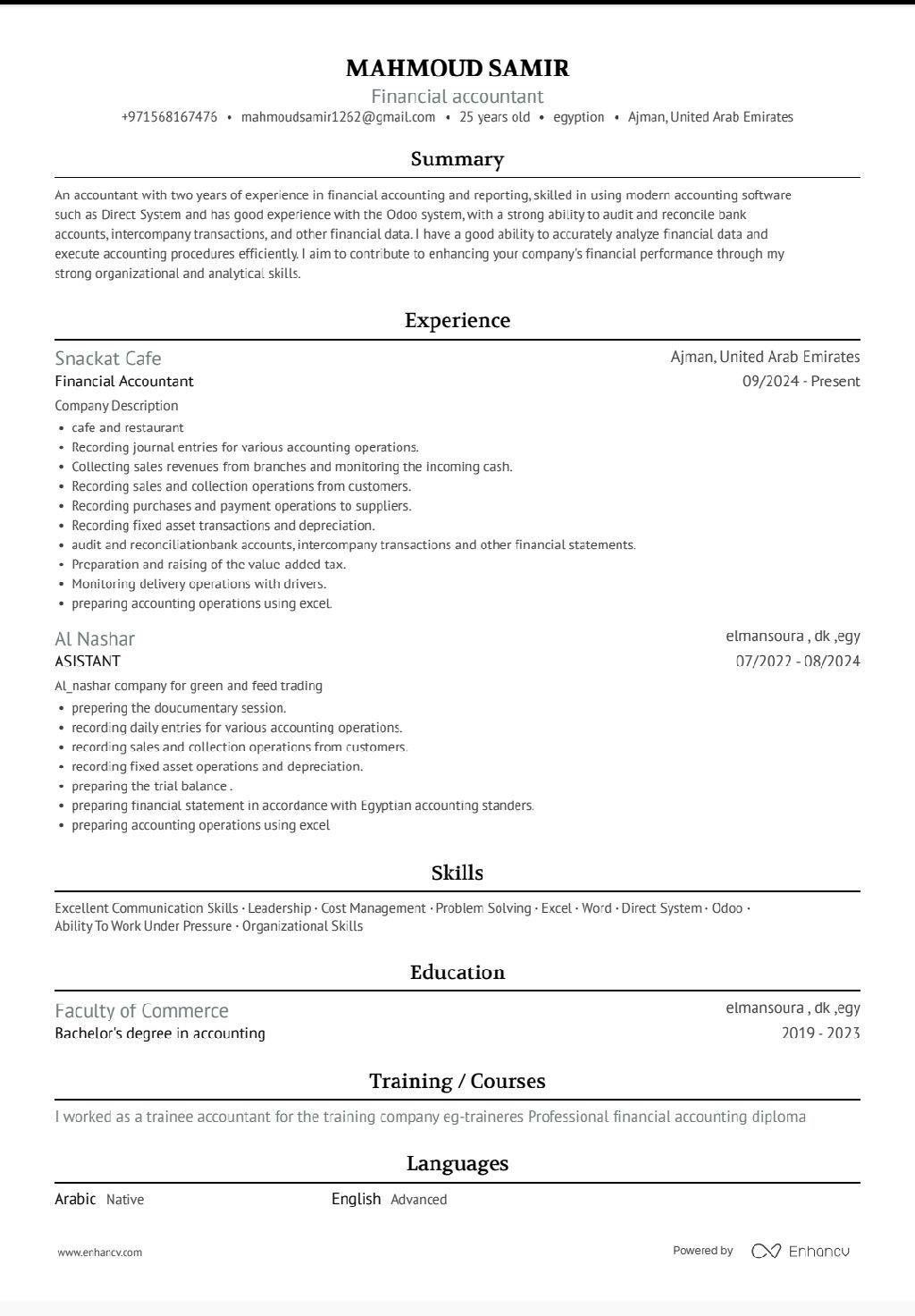محاسب مصري 25 سنة لدي خبرة عامان في الامارات واعمل حاليا علي نظام أودو في شركة مواد غذائية وخبرة عام في مصر علي نظام دايركت سيستم ابحث عن عمل بدوام كامل