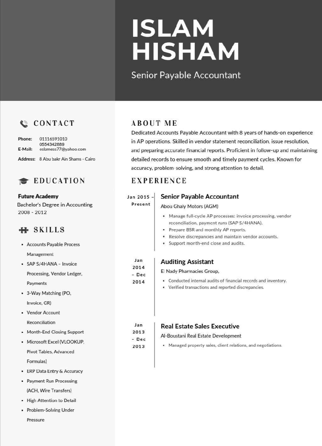 Experienced Accountant with 8 Years of Experience Seeking Job in the UAE Professional accountant with 8 years of experience in accounting and financial management, including financial reporting and account monitoring with high accuracy. Proficient in accounting software and Excel, seeking a suitable opportunity in a reputable company in the UAE to contribute my expertise in improving financial