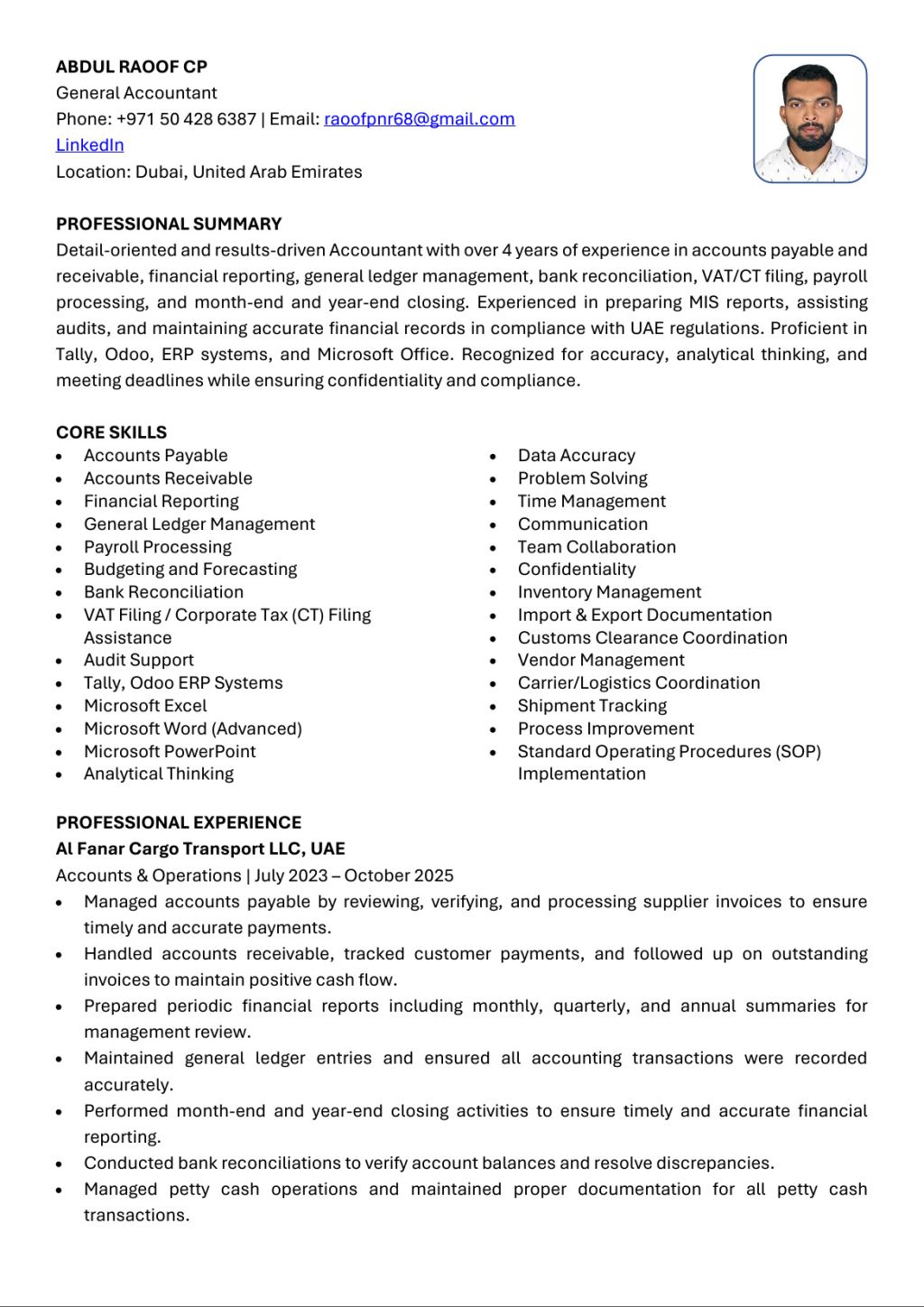 General Accountant (4 + Yrs UAE Exp) available immediately. Skilled in Full Books, VAT/ CT Filing, Payroll, AP/ AR & Audit Support. Proficient in Tally, Odoo & MS Office. Handled Import/ Export docs & Logistics. Fluent in Arabic & English. Visa Cancelled. Contact Abdul Raoof
