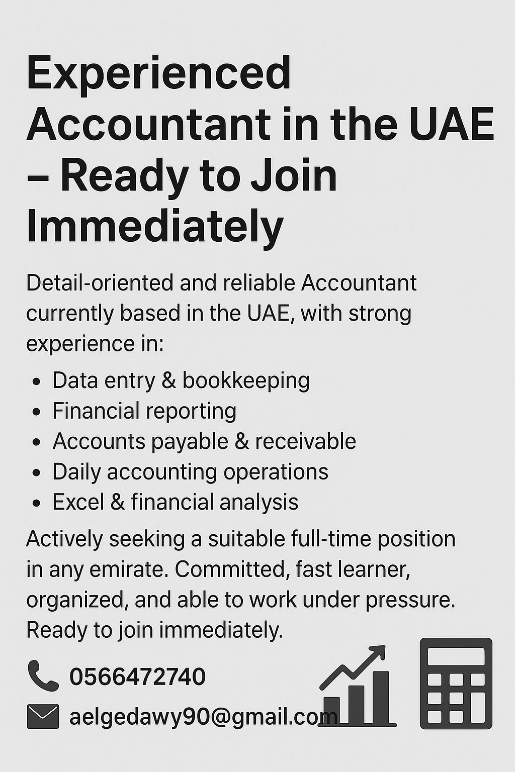 Professional accountant currently residing in the UAE, experienced in data entry, financial reporting, Excel tasks, and daily accounting operations. Actively seeking a suitable position in any emirate. Committed, detail - oriented, fast learner, and able to work under pressure. Ready to join immediately