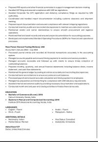 UAE - experienced Accountant with 4 + years in AP/ AR, financial reporting, VAT & Corporate Tax filing, payroll, bank reconciliation, and MIS preparation. Skilled in Tally, Odoo, ERP, and Excel. Dubai - based with immediate availability. Seeking a suitable accounting role to contribute accuracy and strong analytical skills. Contact