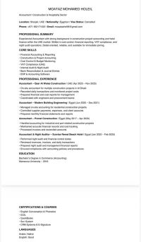 Accountant/ Night Auditor - UAE محاسب محترف بخبرة أكثر من 8 سنوات في شركات المقاولات والفنادق داخل دولة الامارات، امتلك خبرة قوية في الحسابات المالية، المستخلصات، والتدقيق الليلي مع دقة عالية في العمل والالتزام بالمواعيد. أبرز المهارات اعداد ومراجعة القيود اليومية والتقارير المالية خبرة كاملة في Night Audit بالفنادق إدارة المستخلصات والمشاريع والحسابات الختامية مطابقة الايرادات