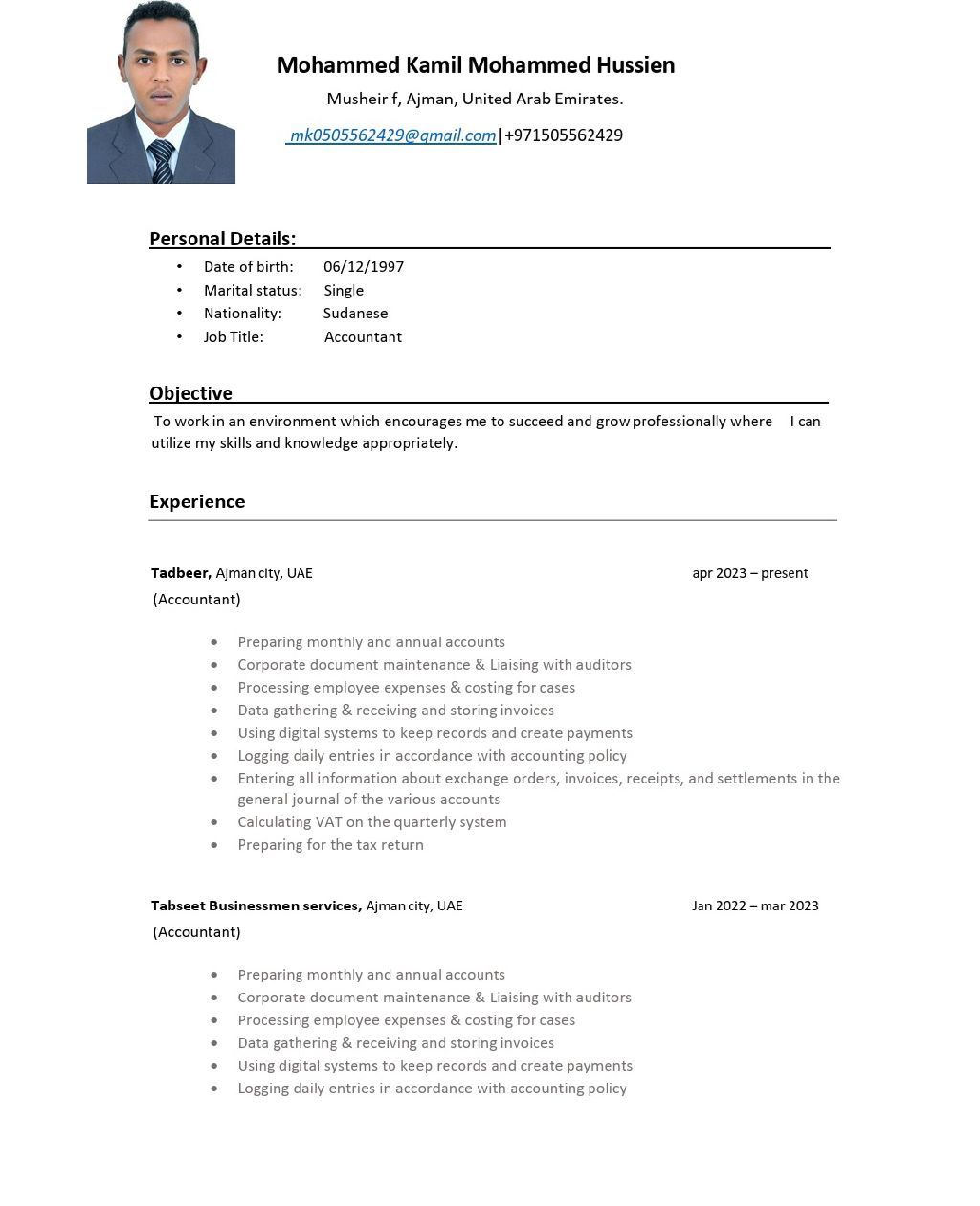 Sudanese accountant based in the UAE with over 4 years of experience in accounting, financial reporting, and VAT preparation. Seeking a suitable job opportunity to add value and grow professionally. Available for immediate interview