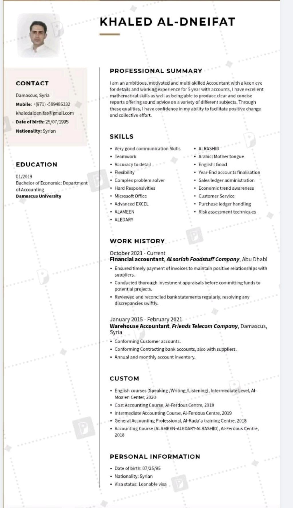 Syrian nationality, with 4 years of experience in the UAE. Committed, reliable, fast learner, and able to work under pressure and adapt to different work environments