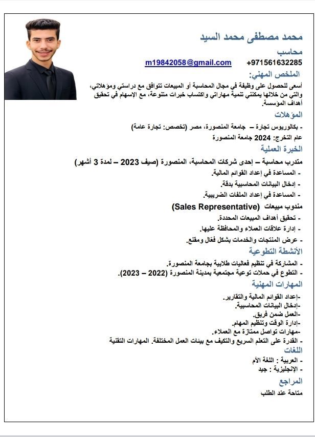 اسمي محمد مصطفى الجنسية مصري معي بكالوريوس تجارة شعبة محاسبة ابحث عن عمل معي إقامة قابلة الاعارة