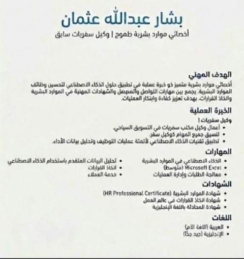 مشرف اداري ذو خبرة عملية في إدارة وتنظيم العمل اليومي، والاشراف على العمال والسائقين، ومتابعة سير العمل لضمان الانضباط وتحقيق الأهداف المطلوبة. متمكن من التنسيق بين الادارات المختلفة، ومتابعة الأداء، وحل المشكلات بشكل عملي وسريع. أجيد العمل تحت الضغط، وأحرص دائما على تحسين بيئة العمل ورفع كفاءة الفريق بما يتناسب مع متطلبات سوق العمل. خبرة في مجالات السيارات ومراكز الصيانة ومغاسل السيارات