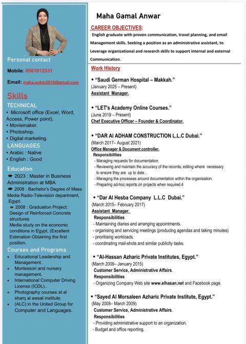 حاصلة على ماجستير ادارة أعمال - خبرة 15 عام منهم 7 سنوات في دبي manger assistant - خبرة في السعودية سنة manager assistant - ممتازة في كل برامج الأوفيس والتصميمات - لدي خبرة كبيرة جدا وسرعة في الأداء وانجاز المهمات المطلوبة وابتكار أفكار جديدة وواثقة جدا أني اضافة لأي مكان اشتغل فيه