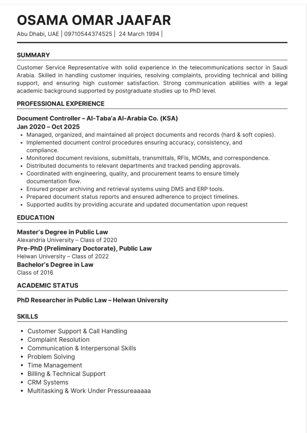 أسامة عمر جعفر مصري الجنسية عمري 31 عام حاصل على ليسانس حقوق وماجستير في القانون العام وتمهيدي دكتوراه في القانون، وعملت لمدة أكثر من ثلاث سنوات في المملكة العربية السعودية في احدي شركات المقاولات كمسؤول ومراقب مستندات كما انني أحمل رخصة القيادة السعودية والمصرية وعملت لمدة ثلاث سنوات أيضا كمسؤول ومراقب مستندات في شركة مقاولات السعداء جروب بجمهورية مصر العربية