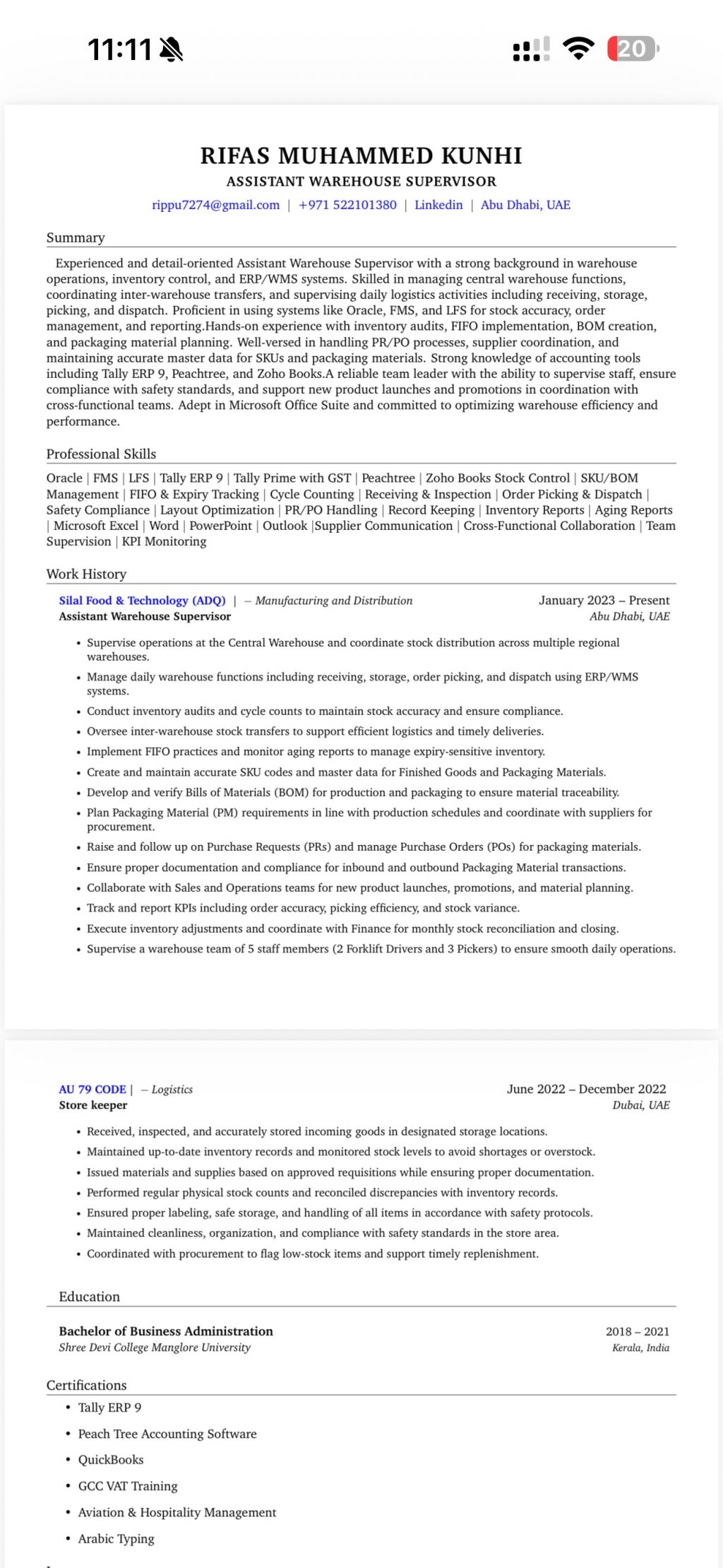 Experienced Assistant Warehouse Supervisor skilled in inventory control, ERP/ WMS, and daily logistics including receiving, storage, picking, and dispatch. Proficient in Oracle, FMS, and LFS, with hands - on audit, FIFO, BOM, and PR/ PO experience. Strong in supplier coordination, data accuracy, team supervision, and improving warehouse efficiency