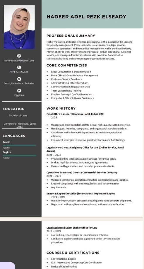 ابحث عن عمل في مجال الفنادق خبرة داخل الدولة من 2022 العمل السابق مديرية فندق بونم اكس دبي + إدارة وتدريب موظفين الاستقبال لتقدم خدمات عملاء عالية لجودة التعامل مع الاستفسارات والشك والطالبات الديون باحترافية لتنسيق مع قسم الفندق الآخر للحفاظ على كفاءة تشغيله