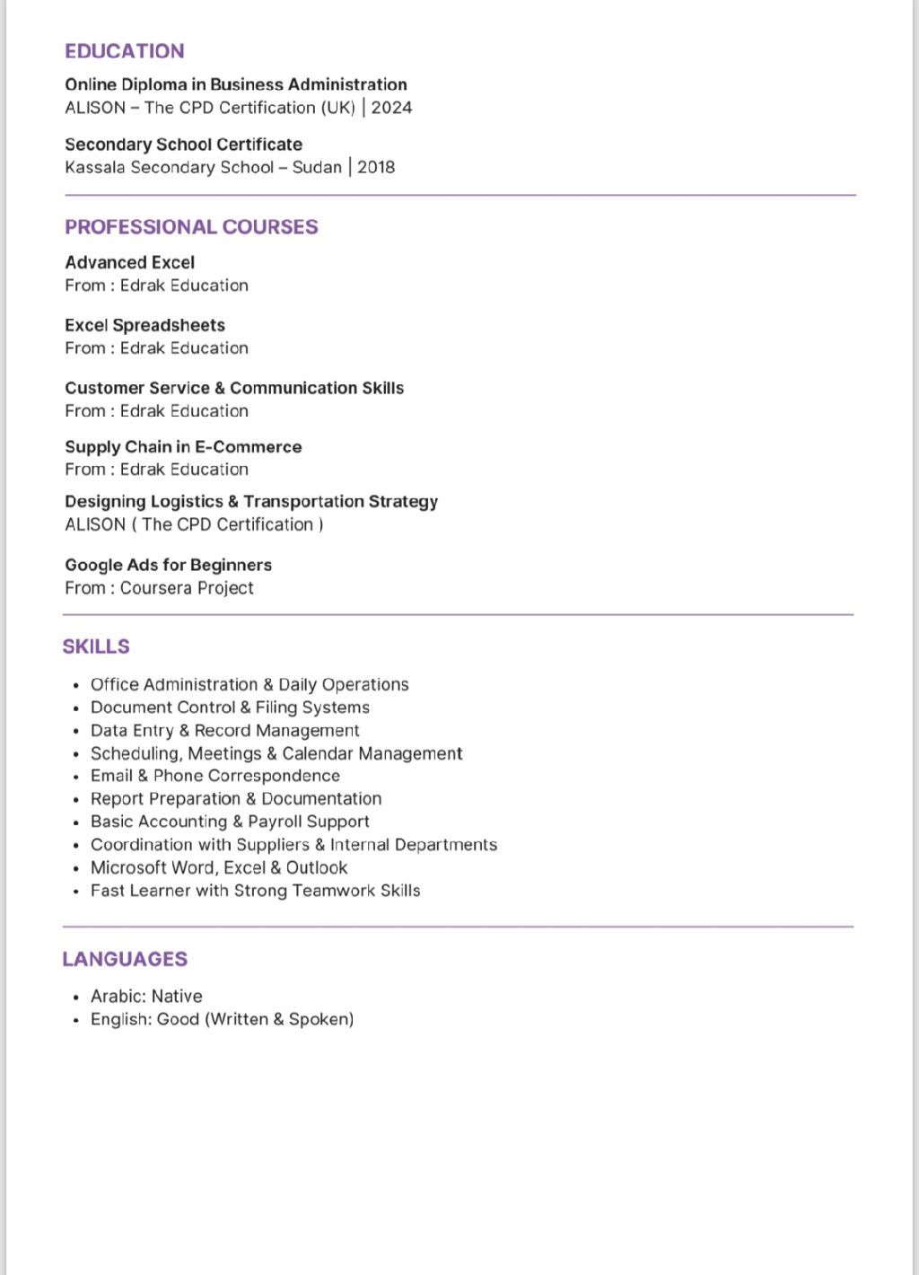 شاب سوداني يبحث عن وظيفة مساعد اداري مشرف عمليات. لدي خبرة أكثر من 5 سنوات في الأعمال الادارية وإدارة العمليات، اعداد التقارير، تنظيم الملفات، التنسيق مع الادارات والموردين، وخدمة العملاء. أجيد استخدام Microsoft Office (Word - Excel) ولدي خبرة في المحاسبة الأساسية واعداد الرواتب