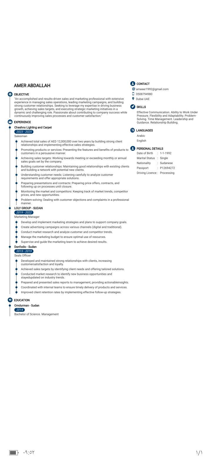 شاب عمل في مجال المبيعات داخل الامارات خبرة في مجال المبيعات واقناع العميل وجلب العملاء الجدد لفترة أربعه سنوات داخل الامارات يوجد لديه شهادة بكالوريوس في ادارة الأعمال مع خبرة في المجال الإدراري 6 سنوات. لديه إقامة سارية. وليس لديه مانع للعمل في أي امارة اغات عربي. انجليزي