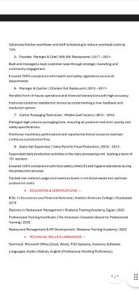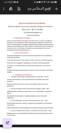 صلاح حسن مدير مطاعم وعمليات خبرة 15 عاما في تأسيس وإدارة المطاعم، التجزئة، والجودة (HACCP) خبير في ضبط التكاليف، المخازن، وقيادة الفرق لزيادة المبيعات. حاصل على بكالوريوس اقتصاد ودبلوم إدارة مطاعم. جاهز للعمل فورا. متوفر رخصة قيادة