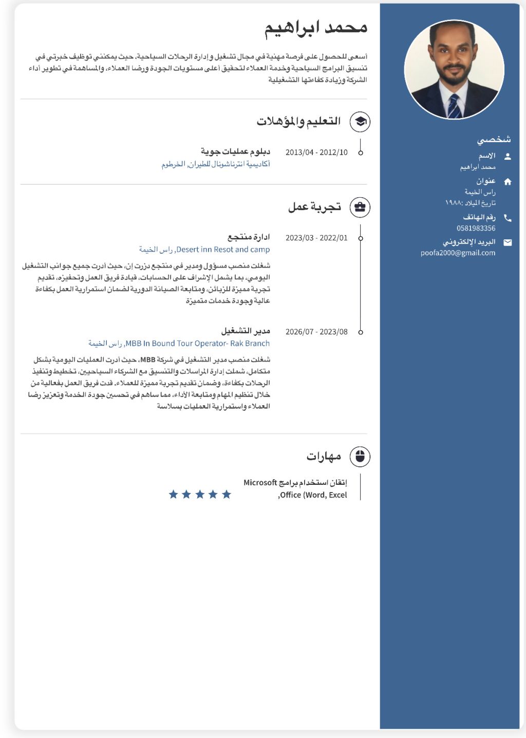 باحث عن عمل (Operations / Admin) لدي خبرة في إدارة العمليات اليومية، التنسيق، وخدمة العملاء. أجيد تنظيم العمل، متابعة المهام، وحل المشكلات بسرعة وكفاءة. امتلك مهارات في Microsoft Office والتواصل والعمل تحت الضغط. اللغات العربية ممتاز، الانجليزية جيد جدا الموقع رأس الخيمة