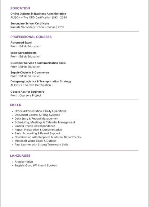 Sudanese professional seeking a position as Administrative Assistant/ Operations Supervisor. Over 5 years of experience in administrative support and office operations, including reporting, documentation, filing systems, coordination with departments and suppliers, and customer service. Proficient in Microsoft Office (Word, Excel) with basic accounting and payroll experience