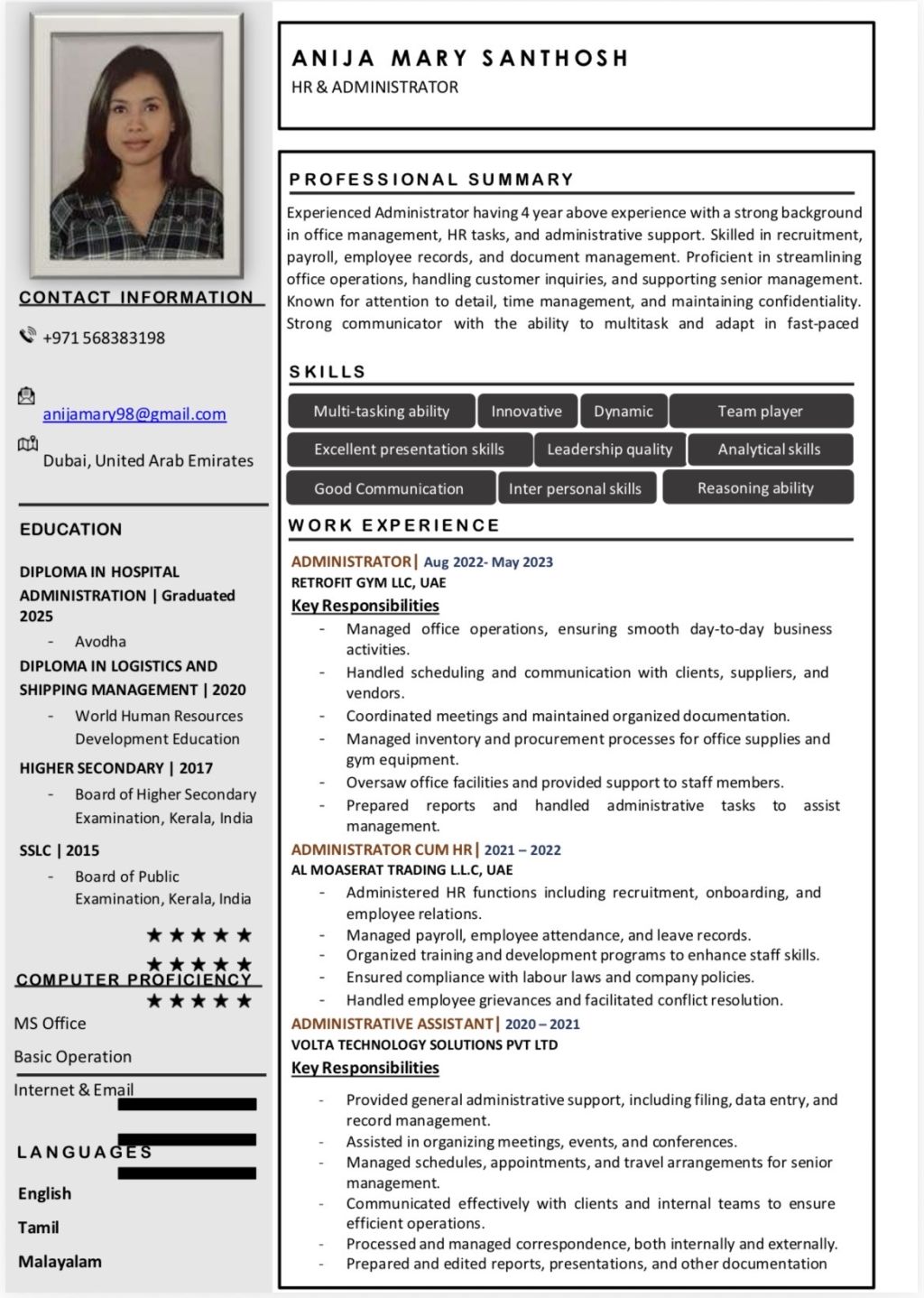 I am Anija Mary Santhosh, an experienced Administrator with over 3 years of service in the UAE. I specialize in scheduling, client/ vendor communication, and efficient use of MS Office and Outlook. I am currently looking for new job opportunities. You can reach me at