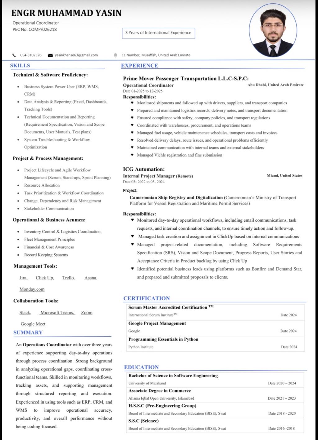An operations coordinator of over three years of experience supporting day to day operations. Skilled in monitoring workflows, tracking assets, and support management through structured reporting and execution. Experience in using tools like ERP, CRM and WMS to improve operational accuracy and productivity