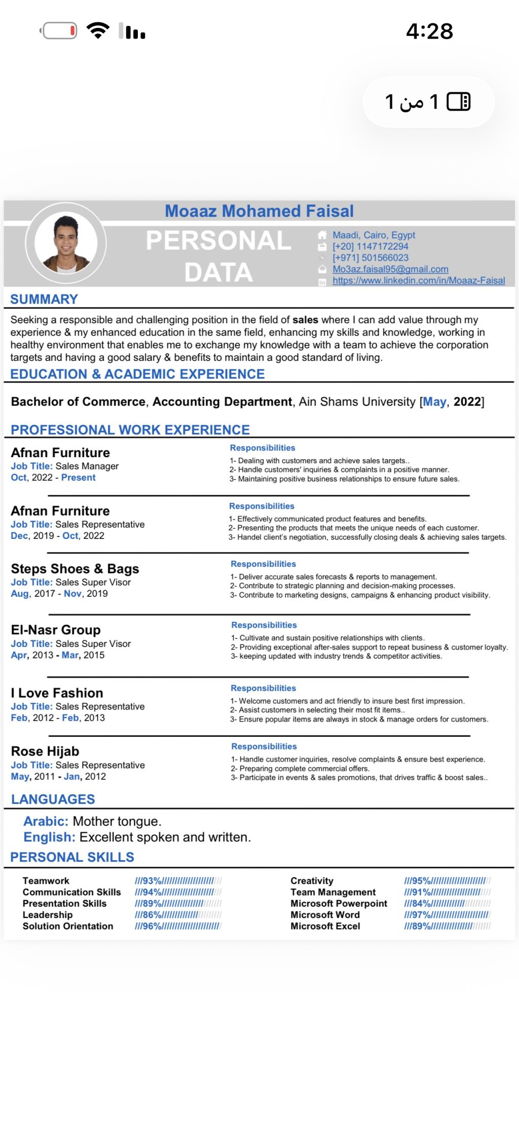 معاذ محمد فيصل 30 سنة (خبرتي) اشتغلت في تنثيق جميع أنواع الحفلات والديكورات ومدير مبيعات وحسابات في شركة أثاث في مصر، ابحث عن عمل أنا في مصر