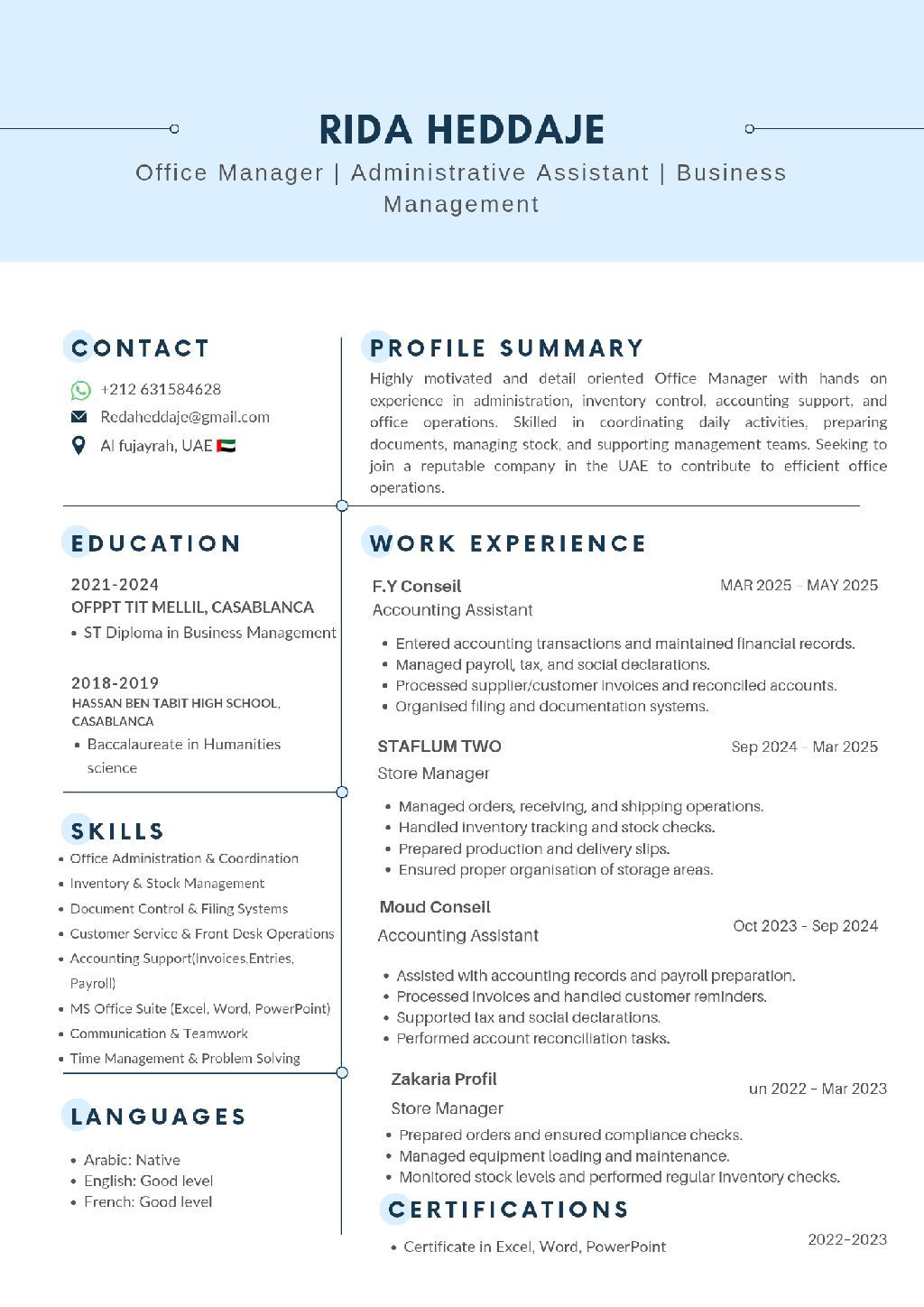Job Seeker - Office Manager/ Administrative Assistant Seeking a job opportunity in the UAE as an Office Manager or Administrative Assistant with support in accounting and inventory management. I have 2 years of experience in office administration, document organization, invoicing follow - up, stock control, and supplier coordination. Organized, reliable, and ready to join immediately