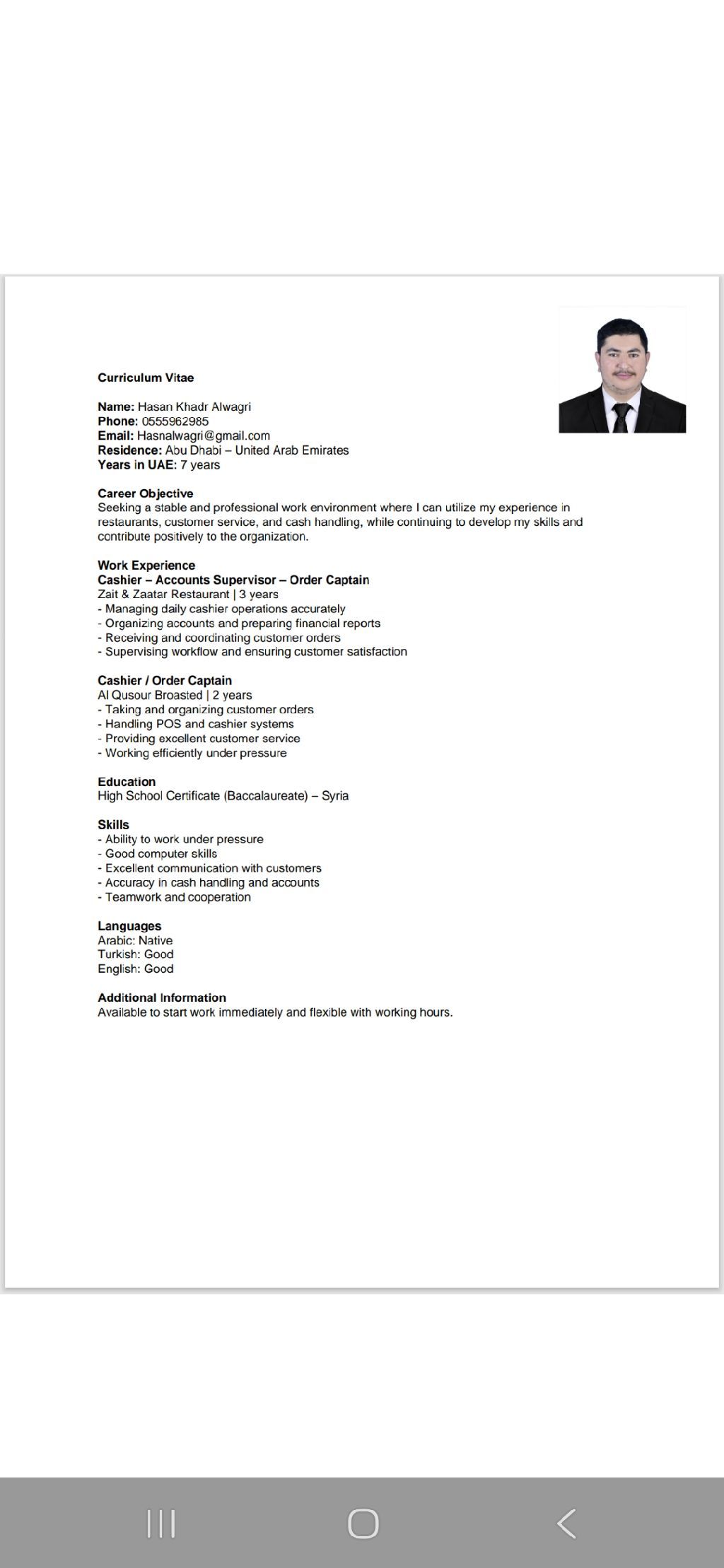 I am seeking a job opportunity in the hospitality sector (restaurants and hotels) I have 6 years of experience within the country and am known for my commitment, fast learning ability, and teamwork skills. I am looking for a suitable opportunity where I can further develop my experience and add value to