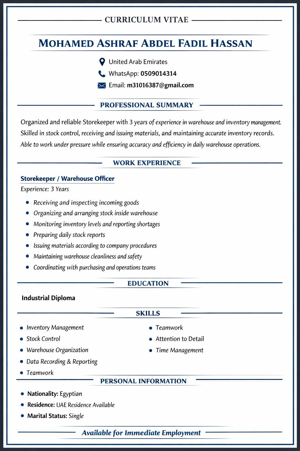 أنا مسؤول مستودعات ومخازن لدي خبرة 3 سنوات معيا إقامة قابلة الاعارة أجيد العربية والانجليزية