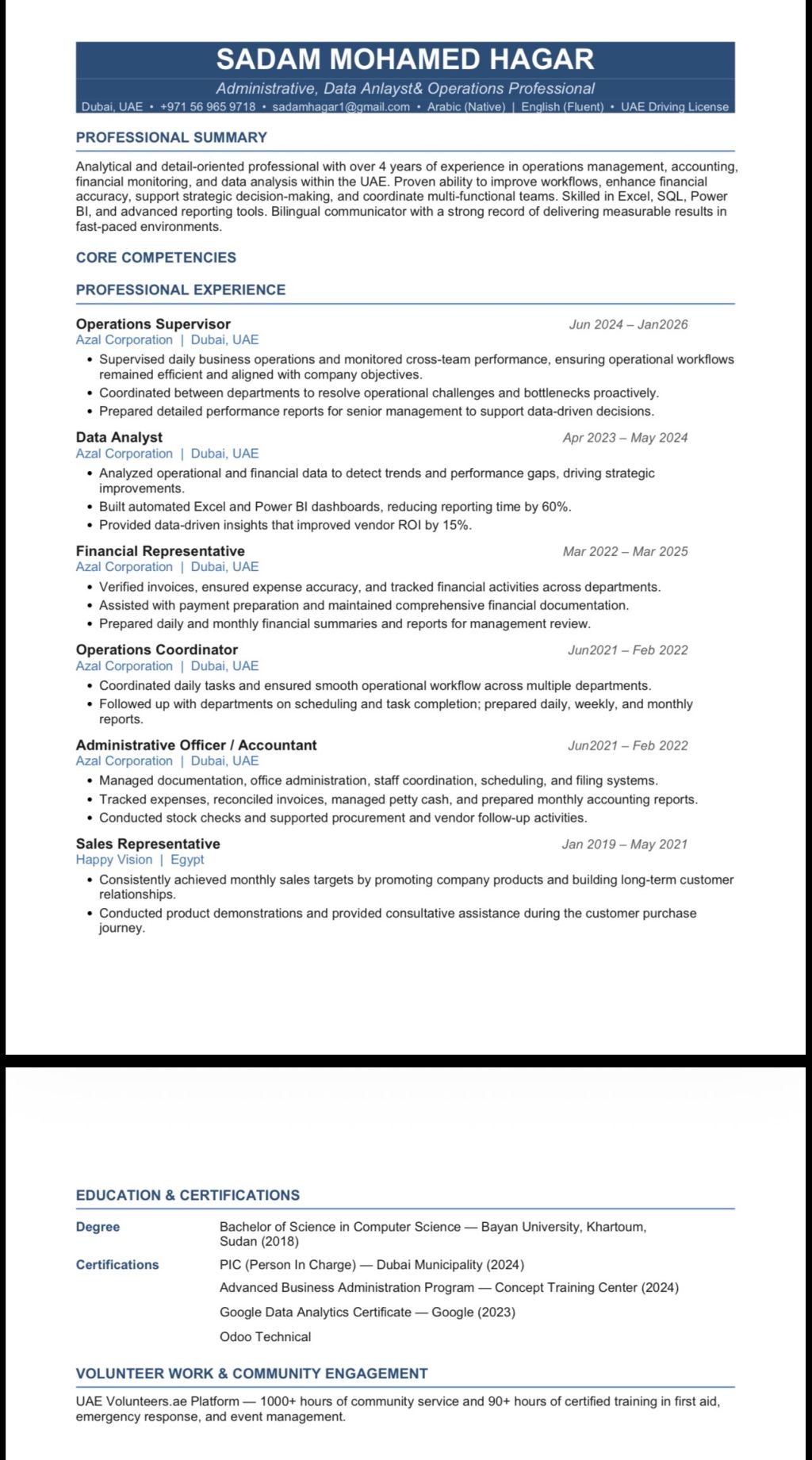 I am seeking a suitable opportunity in administration, operations, or data analysis within the UAE. I hold a Bachelor’s degree in Computer Science and have 4 + years of experience in operations, reporting, and data analysis. Skilled in Excel, Power BI, SQL, and ERP systems. Arabic & English speaker, Sudanese, with a valid driving license. Detail - oriented, organized and available immediately
