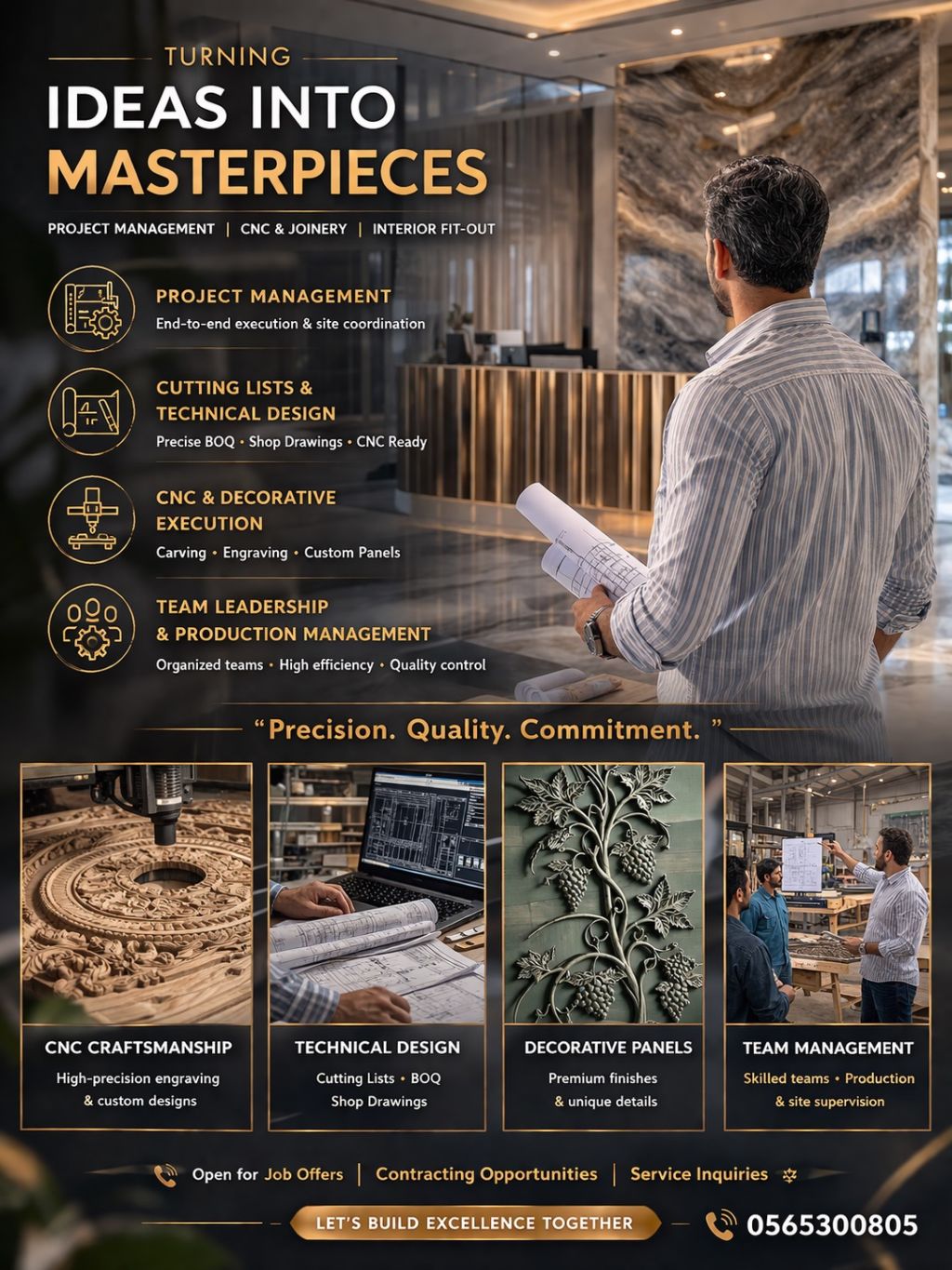 Projects & Production Manager with strong experience in Joinery & Interior Fit - Out across UAE. Delivered hundreds of kitchens, multiple villas, and custom decorative works. Specialized in CNC execution, cutting lists, and production - ready design solutions. Open for job offers, contracting & services