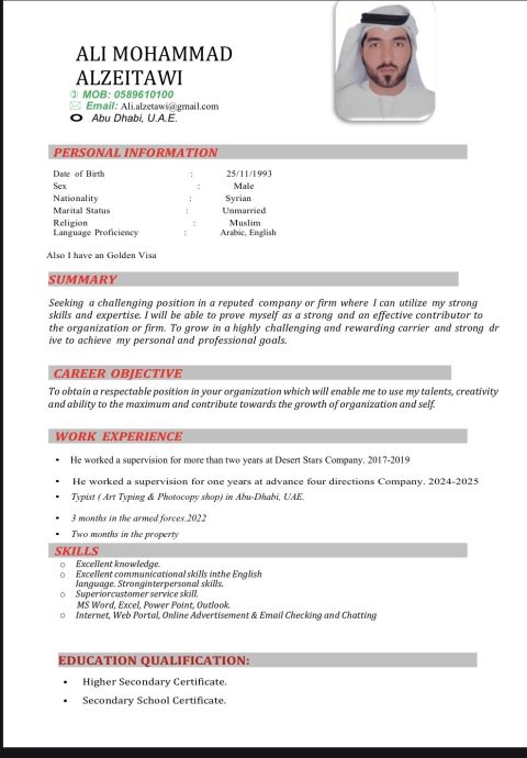 الاسم هيثم سعيد محمد. تاريخ الميلاد 1 يوليو 1983. عملت في مجال الهايبر ماركت لمدة 17 سنة. حاصل على بكالوريوس في الحاسبات. اتقان اللغة الانجليزية جيد. بدأت كموظف وشغلت منصب مدير أغذية طازجة لمدة 7 سنوات، ثم مدير فرع لمدة 4 سنوات. حاليا، اشغل منصب مدير مبيعات في شركة لتوزيع المياه داخل أبوظبي. تاريخ انتهاء الإقامة 4 أبريل 2026
