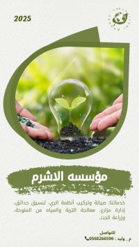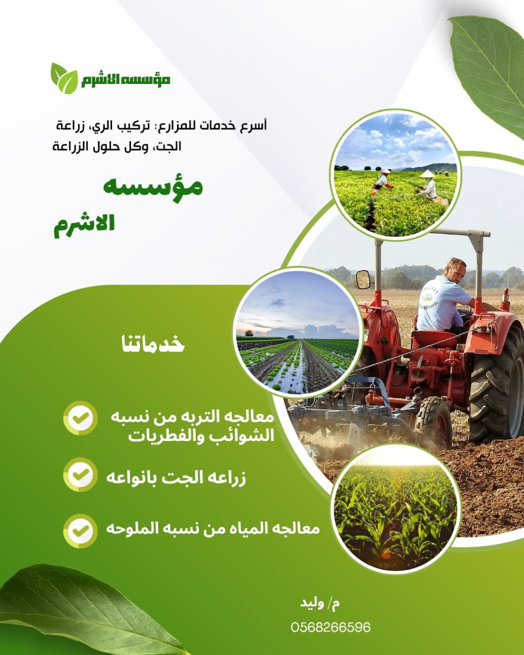توجد لدينا في مؤسسة الأشرم مجموعة خدمات زراعية متنوعه وبأسعار تنافسية بمناسبة العام الجديد وهي كالتالي تنسيق حدائق وشبكات ري ومعالجه التربة من نسبة الشوائب والفطريات ومعالجه المياه من نسبة الملوحة وزراعة الجت بالمزارع ملحوظة توجد لدينا بذور جت عماني أصلي وسماد عضوي معالج من نسبة الشوائب والفطريات