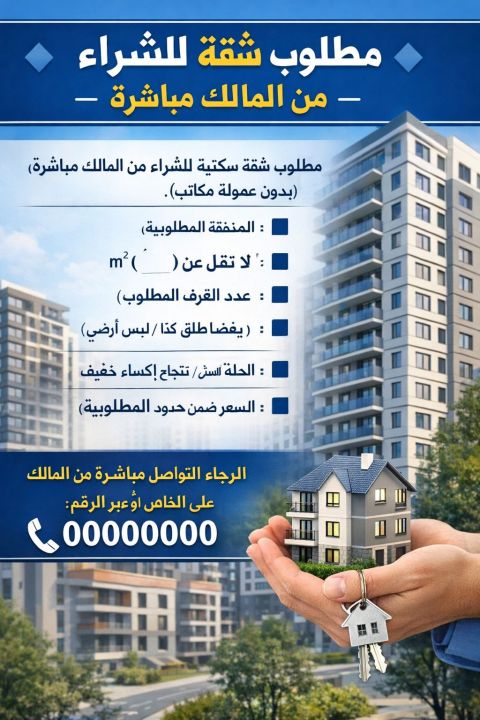 مطلوب للشراء، بالتفصيل ما أريده شقة أو تاون هاوس بغرفتين أو ثلاث غرف نوم - يفضل غرفة للعاملة منزلية) مساحة تزيد عن 1200 قدم مربع - لا أرغب في طوابق عليا - شرفة أو حديقة - نوافذ كبيرة - مبنى جديد أو نظيف - ميزانية تصل الى 1.3 مليون - امكانية الحصول على قرض عقاري