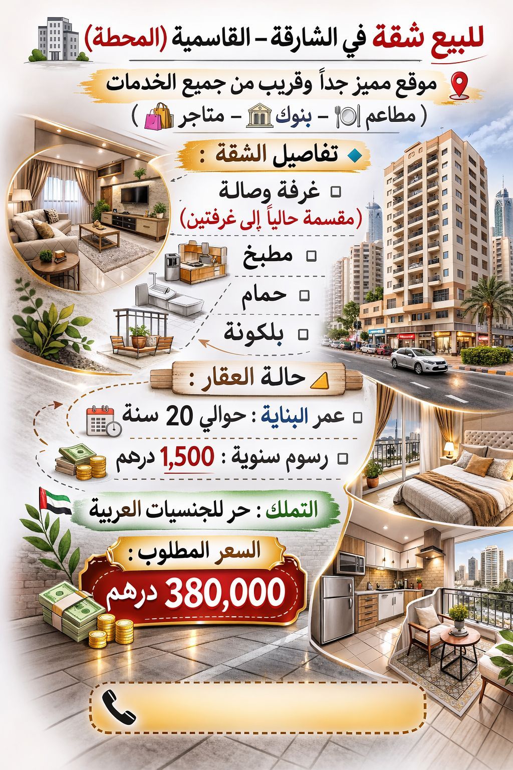 للبيع شقة في الشارقة - القاسمية (المحطة) موقع مميز جدا وقريب من جميع الخدمات (مطاعم - بنوك - متاجر) تفاصيل الشقة غرفة وصالة (مقسمة حاليا الى غرفتين) مطبخ حمام بلكونه حالة العقار عمر البناية حوالي 20 سنة رسوم سنوية 1500 درهم التملك حر للجنسيات العربية السعر المطلوب 380000 درهم