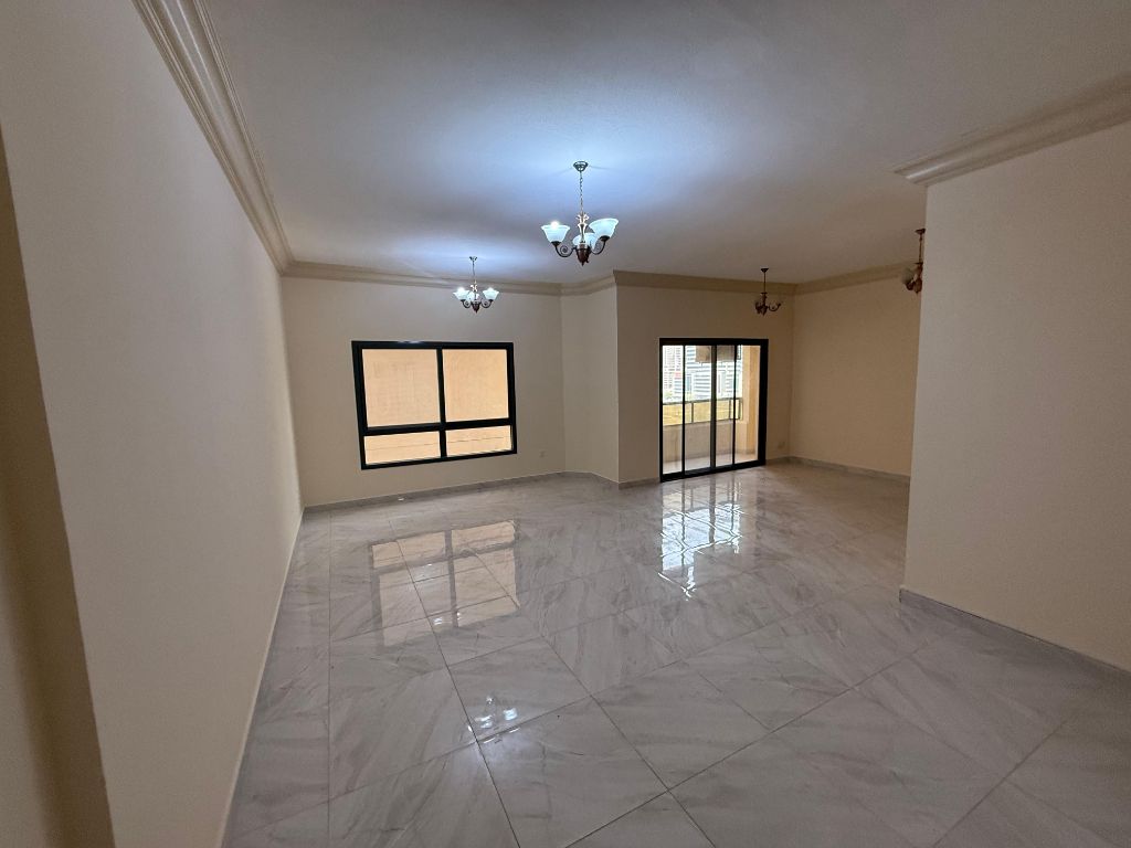 Apartment for sale in Sharjah, Al Majaz area, Al Marwa Tower 1 Consisting of 3 bedrooms, a living room with a balcony, and a maid's room Central air conditioning Area 1680 square feet Fully newly maintained Price 725000 dirhams, negotiable