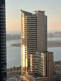 Luxury apartment for sale in Sharjah, specifically in the Al Taawun area. The apartment consists of Two bedrooms (one master) a living room with a balcony overlooking the sea, and a parking space. Three bathrooms with a storage room. Area 104 SQM Area 1120 square feet Price AED670000 The apartment is close to all amenities