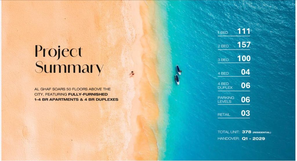 Al Ghaf Tower - A luxurious waterfront lifestyle in Sharjah A distinctive 50 - story residential tower located directly on Al Khan Beach in Sharjah, combining modern luxury with the tranquility of coastal living. fully furnished Apartments and Duplexes One Bedroom Two Bedrooms Three Bedrooms Four Bedrooms + Luxury Duplex Upscale Amenities and Services Infiniti Pool with sea view State - of - the - art Gym