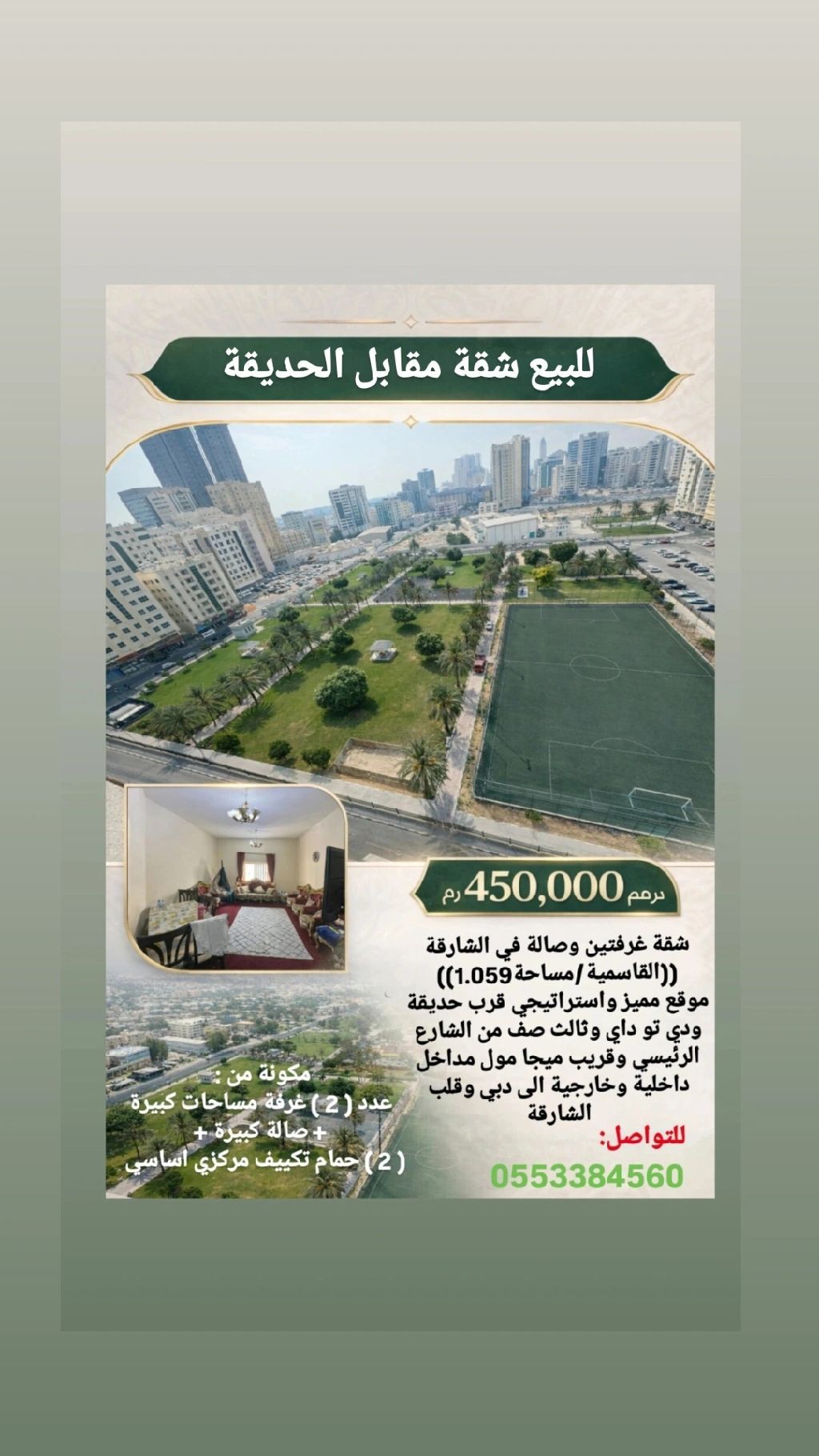 For sale Two - bedroom apartment in Sharjah/ Al Qasimia, measuring 1059 SqFt. Excellent and strategic location opposite the park and D2Day, third row from the main street and close to Mega Mall. Main entrances and exits to Dubai and the heart of Sharjah. Consists of two spacious bedrooms, a large living room, two bathrooms, central air conditioning, and split units. The apartment is currently vac