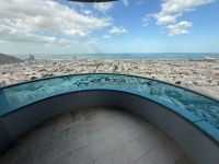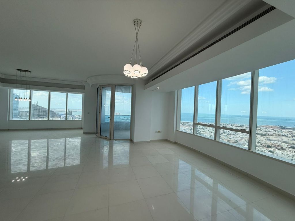 Apartment for sale in Sharjah, Al Majaz 3 area. The apartment features 3 master bedrooms, a large living room with a panoramic view of Al Khan Beach, and a large balcony connected to the living room. It also includes a large kitchen with a balcony offering the same view, a maid's room with an ensuite bathroom, a large storage room, a laundry room, and parking. The apartment boasts a stunning view and