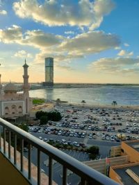 شقة للإيجار 3 غرف وصالة وغرفة خادمة 3 حمامات غرفة ماستر بلكونتين بالشقة اطلالة بحرية مساحة واسعة دواليب بالحائط مواقف حراسة 24 ساعة بناية جديدة مدخل نظيف جدا فندقي الشارقة الممزر على البحيرة بجوار نستو هايبر ماركت ومدرسة فيكتوريا بالقرب من محطة باص دبي