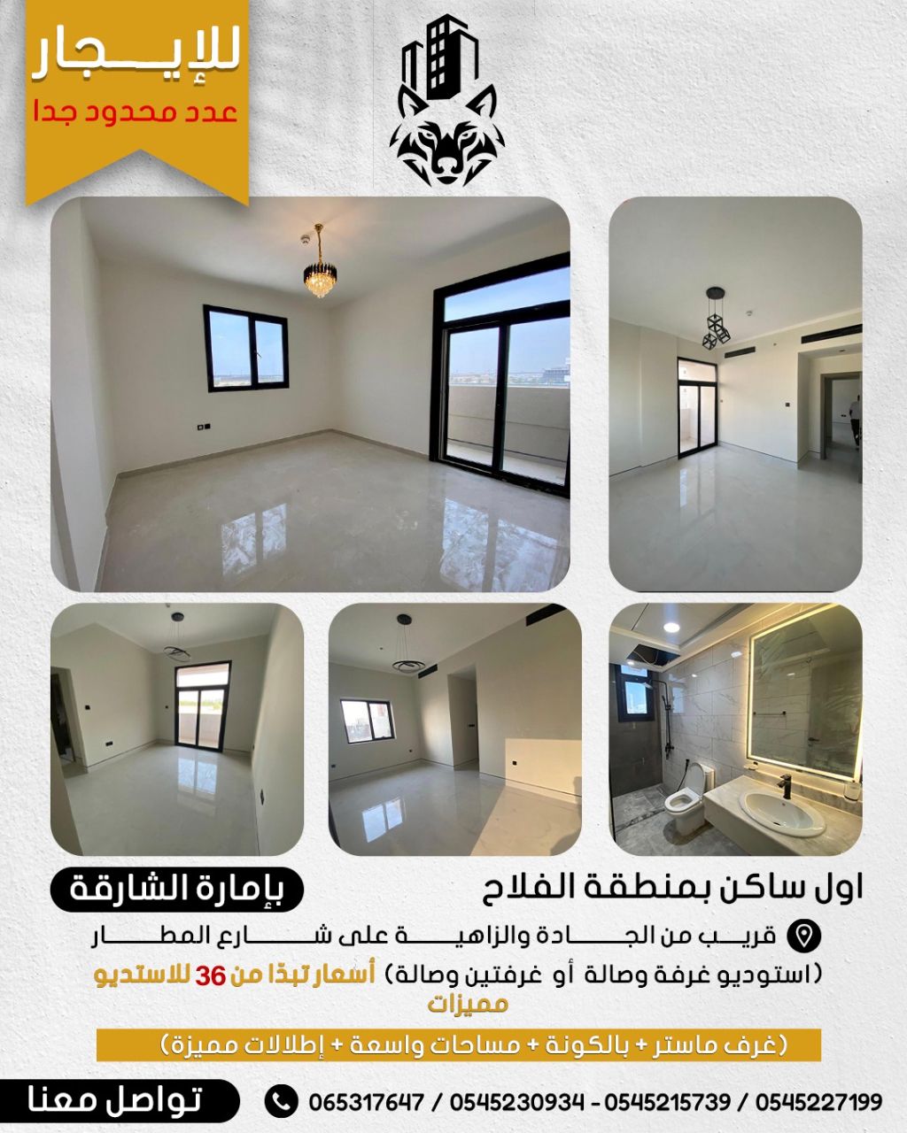 للإيجار في منطقة الفلاح - إمارة الشارقة في موقع مميز شقق سكنية في بناية جديدة أول ساكن بمساحات واسعه وتشطيبات سوبر ديلوكس بأسعار مناسبة للتواصل والاستفسار على الأرقام الموجودة