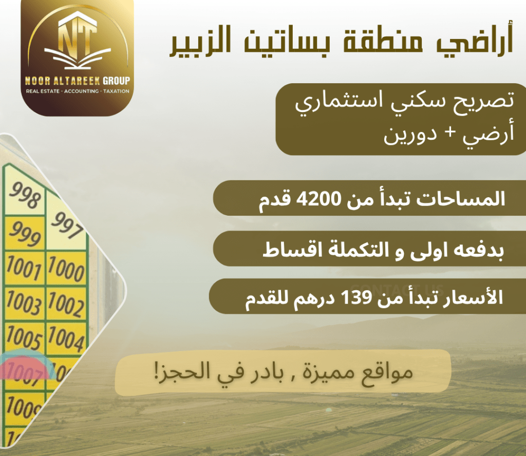 اليك اعلانا احترافيا، دقيقا، وجاذبا بدون أي إيموجي شركة نور تقدم لكم فرصة ذهبية للاستثمار العقاري أرض للبيع في منطقة بساتين الزبير بتصريح سكني - استثماري أرضي + دورين) تفاصيل العرض الموقع بساتين الزبير نوع التصريح سكني / استثماري (أرضي + دورين) المساحات تبدأ من 4200 قدم مربع دفعة أولى ميسرة مع امكانية استكمال المبلغ بنظام الاقساط الأسعار تبدأ من 139 درهم