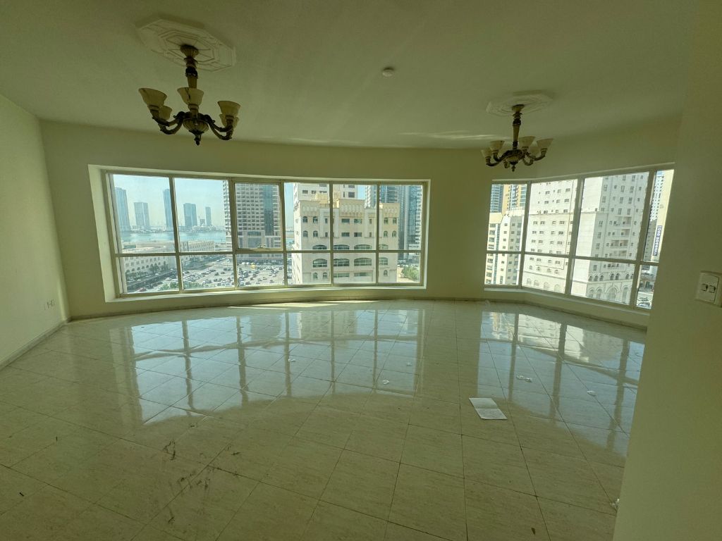 شقة للإيجار في المجاز 3 باطلالة بحرية بانورامية رائعة. تتكون من غرفتين وصالة، غرفة ماستر، عدد 3 حمامات، خزائن بالحائط، مع تكييف على المالك. البناية تضم جيم، مسبح، ومنطقة ألعاب للاطفال. موقع مميز قريب من الكورنيش والخدمات. بدون موقف. السعر 65000 درهم سنويا